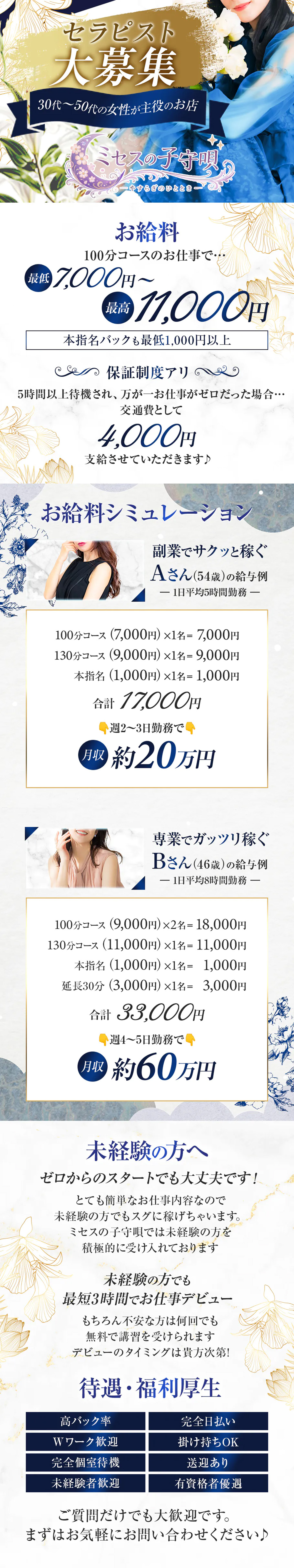 | 応募資格 | 30代~60歳位までのミセスさん 学歴不問 経験者・未経験問わずOKです! お友達同士のご応募OK! 主婦の方・バツイチ・シングルマザー大歓迎 パート・アルバイト感覚で高収入も可能です。 |