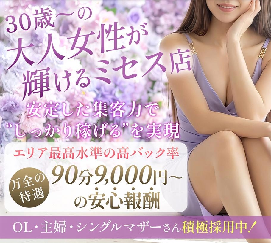 30歳~の大人女性が輝けるミセス店 エリア最高水準の高バック率 × 万全の待遇をご用意 安定した集客力で≪しっかり稼げる≫を実現 ◆ 最低でも【90分9,000円〜】の安心の報酬 ◆ OLさん・主婦の方・シングルマザーの方も積極採用中