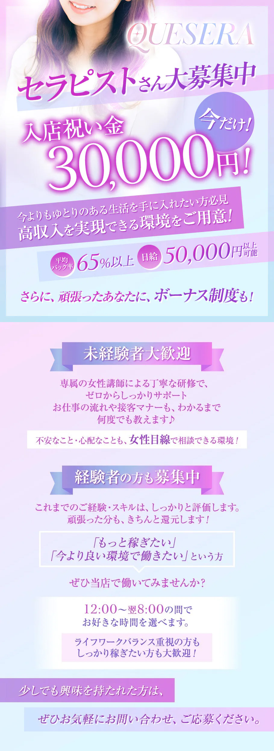 ✨新規オープンにつきセラピストさん大量募集✨ いまなら【入店祝い金 30,000円】プレゼント! 条件は《採用後5回出勤するだけ》でOK♪